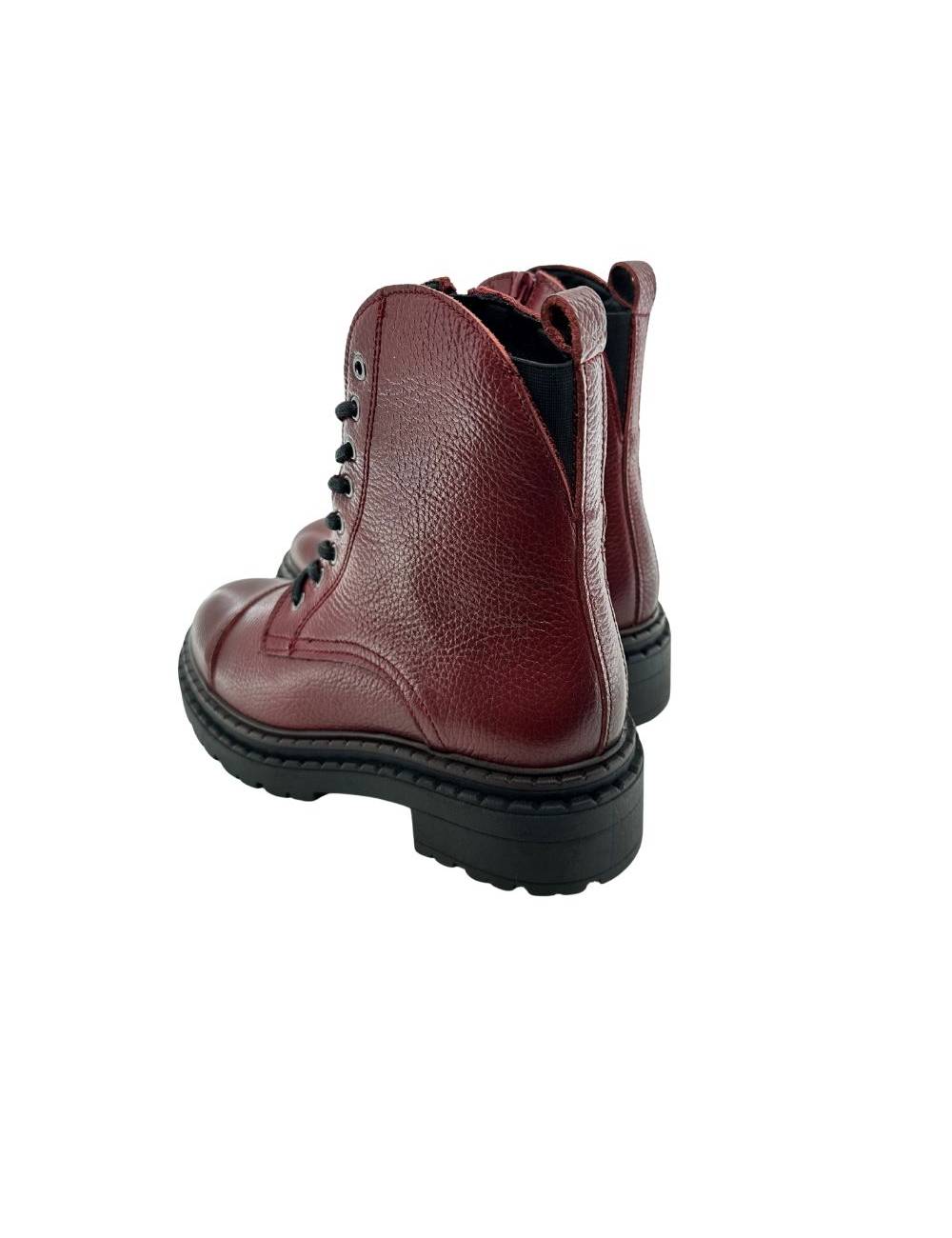 Bota estilo militar para mujer en piel burdeos. Diseño robusto y actual, perfecto para looks urbanos y con personalidad.