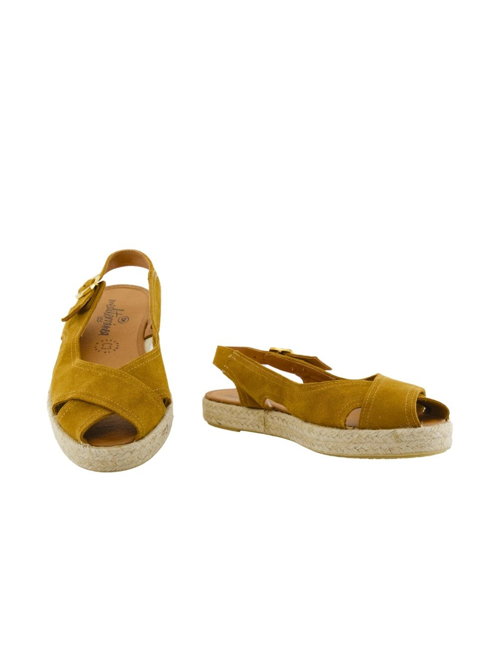 Descubre las sandalias de serraje Mediterránea 30071 para mujer, con diseño de punta abierta y suela de yute trenzado. Disponibles en color whisky. Elegancia y confort en cada paso.