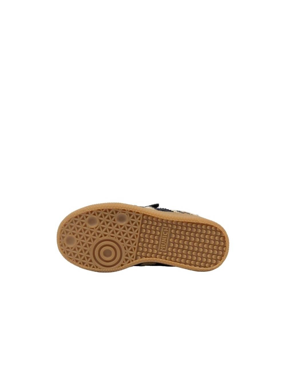 Estilo urbano y toque salvaje conviven en la Munich Mini Astro, un modelo infantil que convierte cada paso en una aventura divertida. Parte superior confeccionada en pelo sintético beige con estampado leopardo, un acabado suave al tacto que resalta gracias a los refuerzos de piel sintética negra en empeine, talón y puntera. La clásica “X” lateral, también en negro, ofrece soporte adicional y armoniza con los ribetes del corte. Dos tiras autoadherentes sustituyen a los cordones, garantizando independencia a la pequeña usuaria y permitiendo un ajuste rápido y seguro durante el juego.
