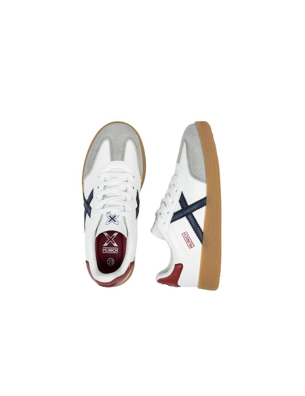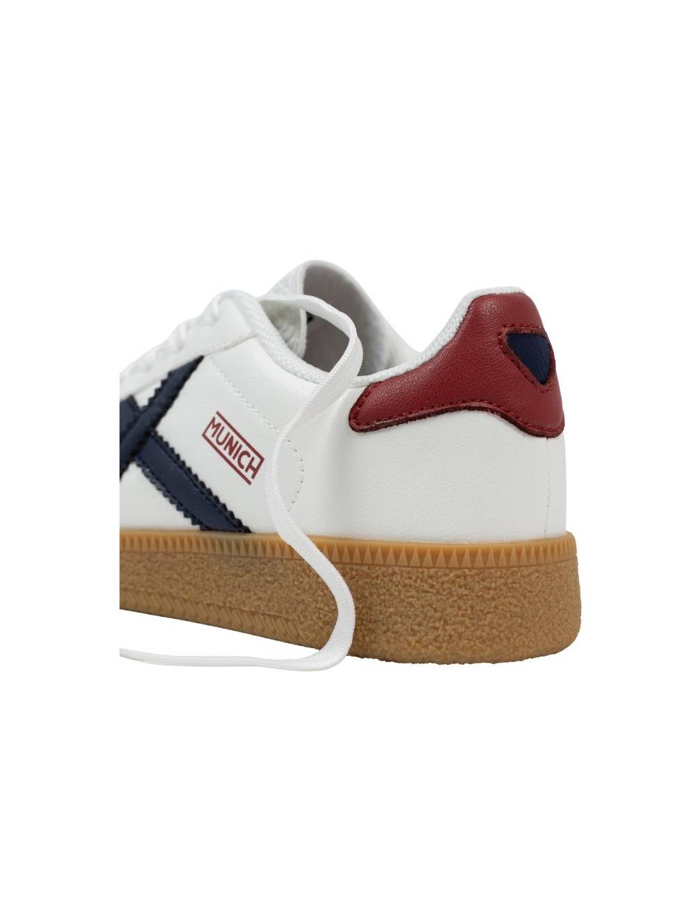 La zona del talón se anima con un parche de piel sintética rojo granate, detalle cromático que ayuda a diferenciar pies y aporta un guiño de estilo. Los cordones planos blancos permiten un ajuste fino para los niños que ya dominan el lazado, garantizando sujeción segura durante saltos y carreras.