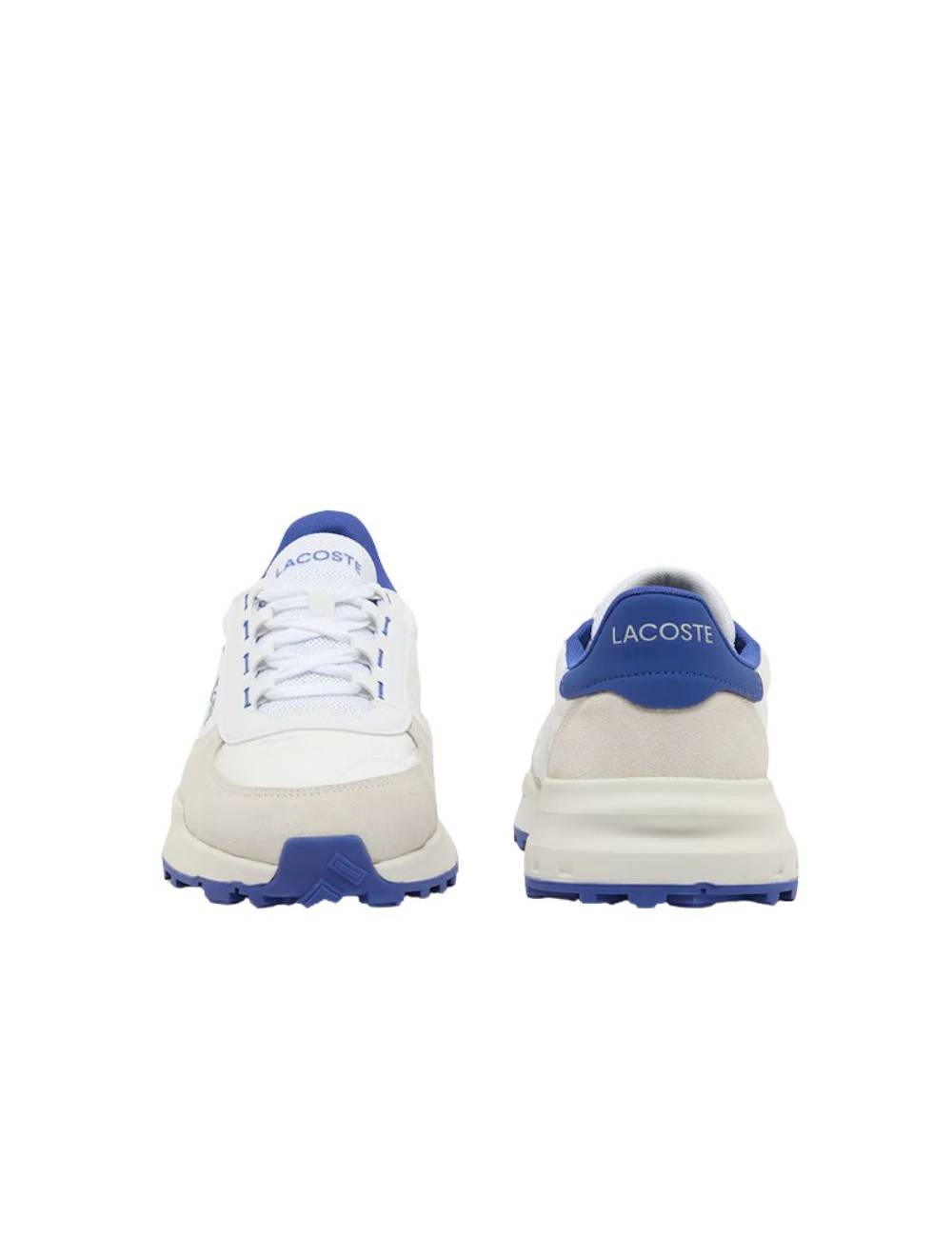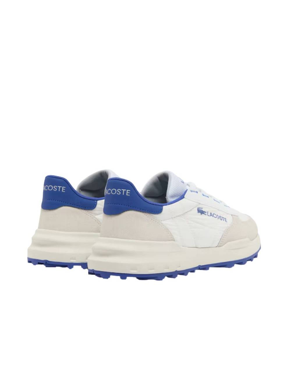 La parte superior combina tejido técnico blanco satinado con superposiciones en gamuza beige clara, generando un contraste elegante y dinámico. El talón y el forro en azul intenso aportan un acento vibrante, mientras que el logo LACOSTE en azul marino y el cocodrilo bordado en el lateral refuerzan el carácter deportivo con un toque clásico.