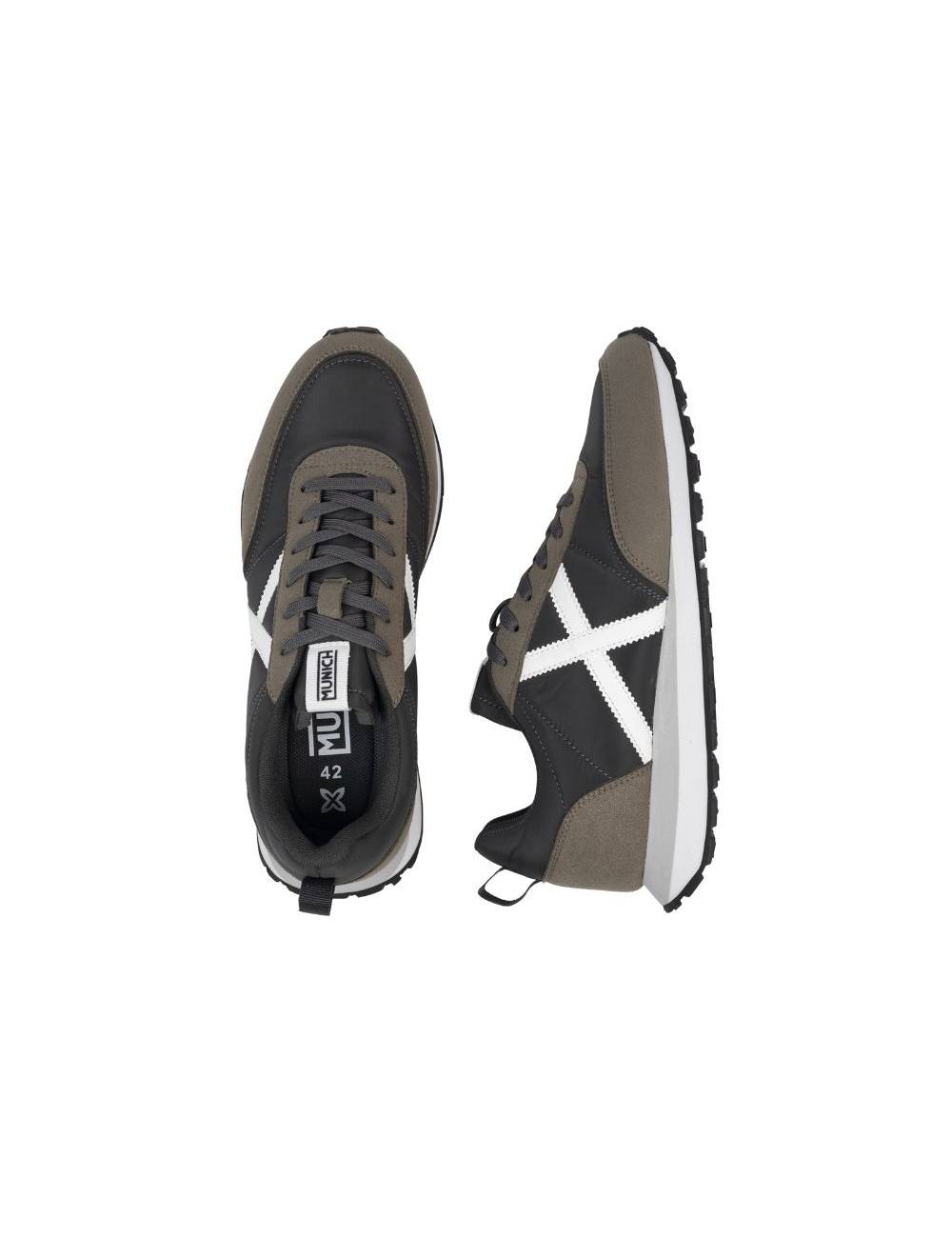 Suela exterior de caucho negro con patrón waffle de tacos cuadrados y logotipo “MUNICH” moldeado; un diseño que agarra con firmeza aceras lisas, pavimento húmedo o grava compacta. Tirador posterior y lengüeta con cinta facilitan el calce y evitan deformaciones, mientras cordones planos gris oscuro regulan el ajuste y complementan la paleta sobria. Costuras reforzadas estratégicamente en zonas de mayor flexión, garantizando durabilidad sin sacrificar flexibilidad.
