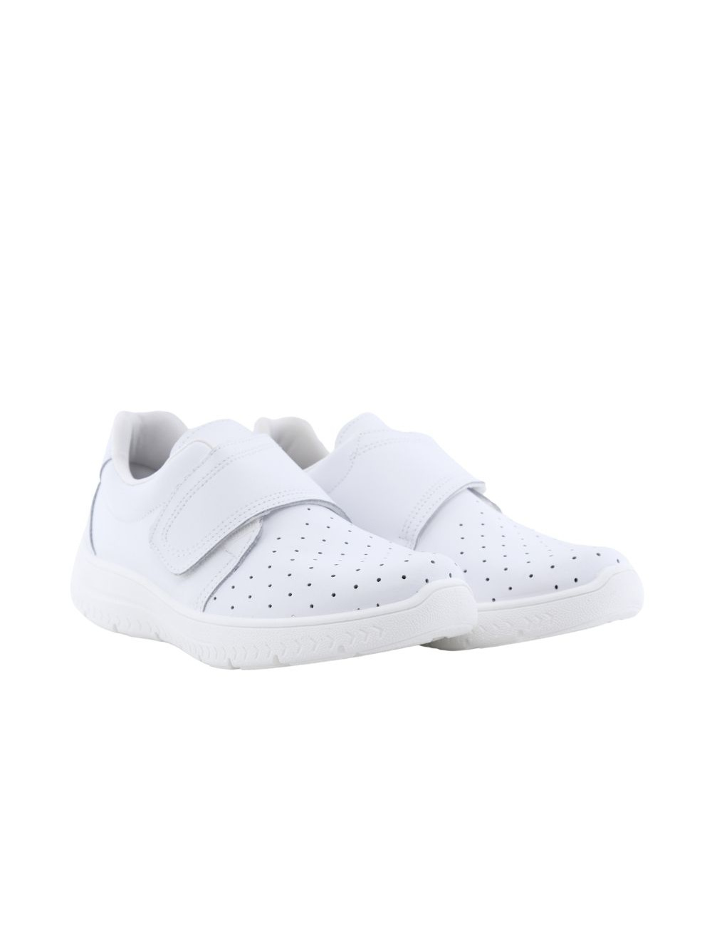 Calzado deportivo para mujer en piel con diseño picado, cierre de velcro y suela antideslizante. Ideal para largas jornadas. ¡Comodidad y diseño en cada paso!